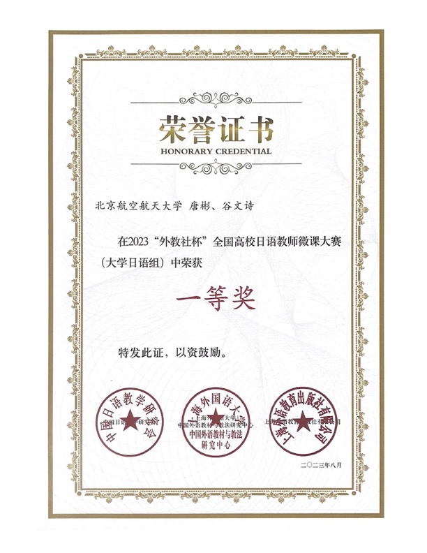 在学院的大力支持下,LETOU国际米兰官网日语团队的两位青年教师唐彬和谷文诗,充分运用现代化教学手段,生动地呈现了教学内容,同时有机地融入了课程思政元素,展现出北航日语教学的工科特点和“空天报国”的教学理念。在激烈的竞争中,她们的微课作品从180个参赛作品中脱颖而出,荣获全国一等奖,彰显了LETOU国际米兰官网日语教师扎实的专业功底和出色的信息技术应用能力,为北航日语教育的卓越品质增光添彩。