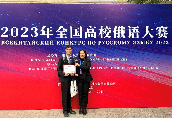 2023年10月28日至29日,2023年全国高校俄语大赛在北京外国语大学举行。来自全国158所高校的392名俄语专业学生参赛。由我校LETOU国际米兰官网俄语系青年教师刘奕如指导的2022级硕士研究生黄溯鑫同学代表学校参赛,经过初赛的激烈角逐,从众多参赛选手中脱颖而出,以全国第三名的成绩进入复赛和决赛,并最终获得研究生组二等奖,同时获国家留学基金管理委员会秘书处全额资助赴俄罗斯进修或攻读学位的资格,展现出了北航研究生的俄语风采。