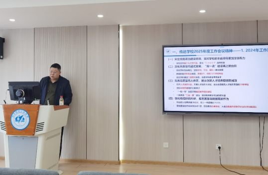 学院党委书记肖洪传达了学校2025年度工作会暨第九届教职工代表大会第六次会议精神,学习赵长禄书记、王云鹏校长讲话精神,学习2025“数智赋能年”各项重点工作和学院年度目标任务。他强调,在新的一年里,全体教职工要坚持以习近平新时代中国特色社会主义思想为指导,学院要持续深化综合改革,以关键业绩指标为引,党建与业务深度融合,推进学院高质量发展。