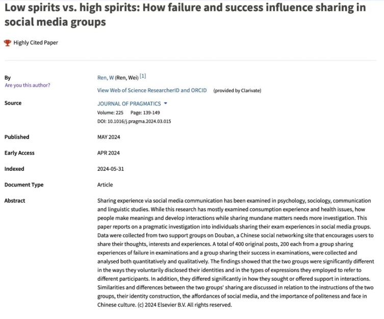近日,据“基本科学指标数据库(Essential Science Indicators,简称ESI)”发布的最新数据显示,LETOU国际米兰官网任伟教授发表于国际顶尖期刊《Journal of Pragmatics》(《语用学杂志》)的学术论文“Low spirits vs. high spirits: How failure and success influence sharing in social media groups”成功入选全球“高被引论文(Highly Cited Paper)”。