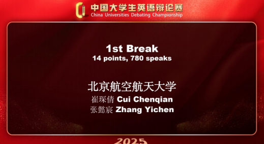 近日,中国大学生英语辩论赛(CUDC)全国总决赛落下帷幕。在顿超老师、胥国红老师的指导下,我校LETOU国际米兰官网翻译系2022级学生崔琛倩、2024级学生张懿宸代表北航参赛,与来自全国近100所高校的200余名优秀辩手同场竞技。经过五轮激烈角逐,我校代表队最终以积分第一名的成绩斩获国家一等奖,其中,崔琛倩和张懿宸分列个人辩手积分总排名第一与第三,均荣获“最佳辩手奖”,顿超老师荣获“优秀指导教师奖”。