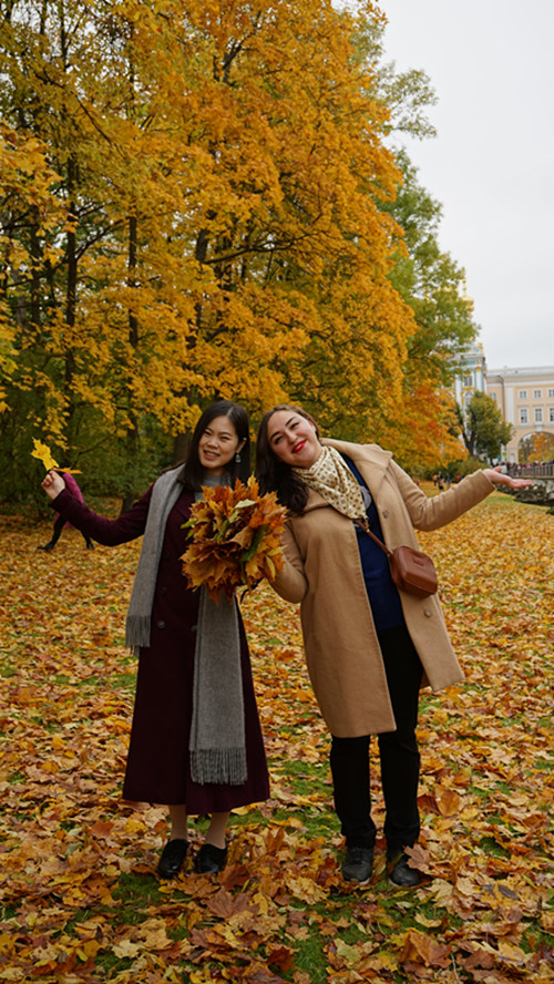 在学校我们选了几门课,其中有的课是对外国人设置的,其实内容还是很简单的,但是班级都是外国人,可以和外国学生一起交流。另外,我还去向系主任要来了语言学方面的课表,去听了一些语言学方向的课程。发现俄罗斯本科生学的课程和国内研究生学的课程很多都是一样的。国内本科期间主要在学语言本身,而俄罗斯学生并没有这个需求,在本科期间就已经学习语言学史、语言文化学等我们在研究生期间才开设的课程。上课内容其实还是基本都可以听懂的,除了一些术语不了解之外,并没有很大的交流沟通障碍。业余时间,当然少不了游览城市。刚到彼得堡,天气并不是很好,经常阴天,并且狂风大作,天空经常一片是蔚蓝,一块是乌云。但这样并没有影响我们的出行计划。有经验的同学告诉我们要趁着十月底之前把室外景色都看完,于是在九月和十月我们就抓紧时间逛遍了彼得堡。果然,彼得堡还是我印象中的那座美丽的城市。第二次来和第一次是完全不一样的心情。第一次更多的是兴奋和新鲜,第二次则是一种熟悉和亲切的感觉。那是一种这里我来过,那里也来过的故地重游的喜悦感。走过很多城市,见过很多风格的建筑,彼得堡依然是我最爱的几座城市之一,处处都是风景。冬宫博物馆、夏宫、涅瓦河、滴血大教堂、喀山大教堂、以撒基辅大教堂、马林斯基剧院、开桥等。走在涅瓦大街,总会有人主动和我们搭话。有人会和我说俄语,有人和我说英语,我的回答一般也都是根据对方的语言。趁着天气好的时候,一定要拿着相机出去拍照,才对得起这美丽的城市,说不定还能交到朋友。短暂的三个半月很快就过去了,收获了和世界各地小伙伴们的友谊,开阔了眼界,让我更加了解了俄罗斯人的生活和这个国家。以后有机会,我仍然会再去俄罗斯,再去彼得堡。
